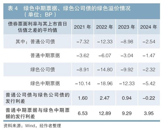 从符合商业银行投资偏好的较优质信用债(中债隐含评级在AA+及以上)来看,自2023年以来,与普通债券相比,绿色债券的发行溢价有所下降。笔者以公司债、中期票据为样本,分别观察普通债券和绿色债券的发行利率与其上市首日中债估值的偏离度。通过对比发现,普通债券和绿色债券的发行利率均低于其上市首日的中债估值,且绿色债券向下偏离的幅度更大,即绿色债券可为发行人节约更多发行成本。但从走势上看,绿色债券的这项优势自2023年以来有所弱化。例如,与普通中期票据相比,绿色中期票据平均节约的发行成本由2021年的6.53基点(BP)降至2024年的3.95BP(见表4),或将在一定程度上影响企业发行绿色债券的意愿。