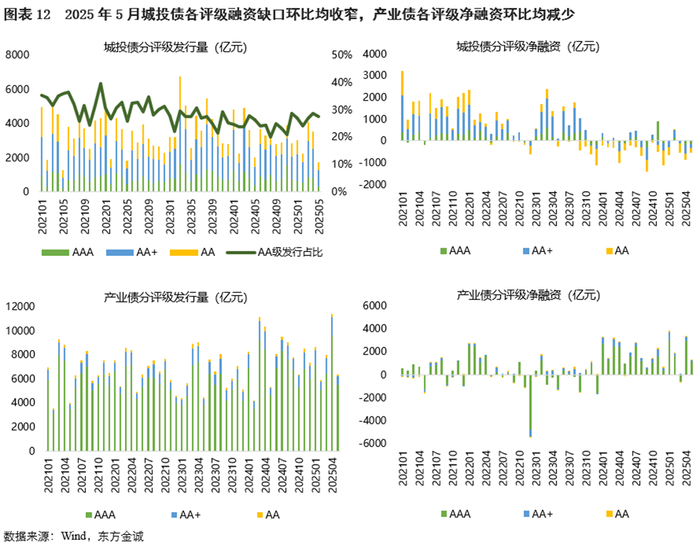 分主体评级看,5月各评级信用债发行量环比均减少,同比仅AAA级发行量有所增加,AA级发行量占比较上月下降1.4pct至7.2%;AAA级信用债净融资环比减少1849亿元,同比小幅增加,AA+级和AA级信用债融资缺口环比、同比均有所收窄。