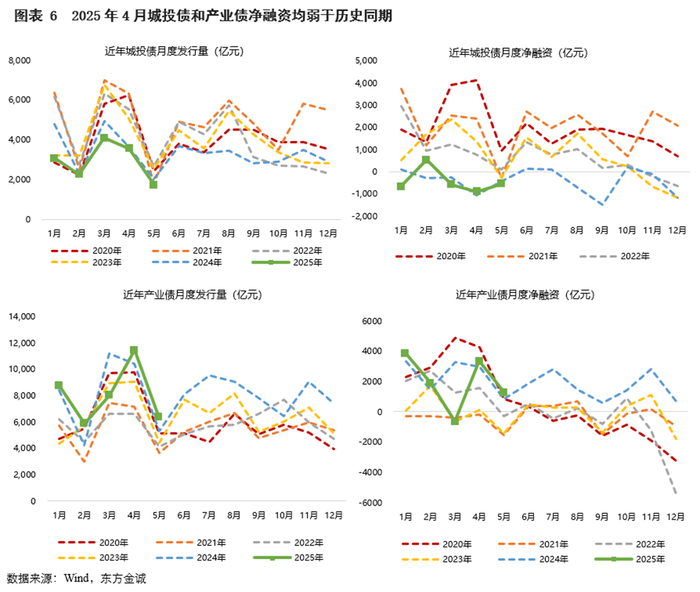 5月城投债和产业债融资继续明显分化。城投债融资监管保持严格基调,当月发行量1739亿元,环比、同比均减少,净融资缺口环比小幅收窄,同比走阔;1-5月累计,城投债发行量同比下降16.7%至1.46万亿元,净融资缺口同比扩大234亿元至-2175亿元。1-5月各月,城投债净融资均处于2020年以来的同期较低水平(图表6)。