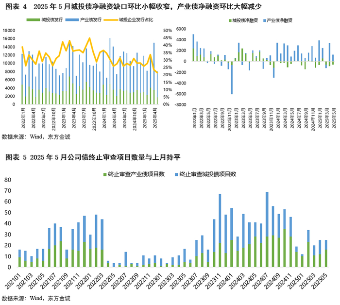 受季节性因素影响,5月信用债发行量和净融资均环比减少、但同比增加。当月城投债和产业债融资延续分化:城投债发行量环比、同比均减少,净融资缺口环比收窄、同比走阔;因科技创新债券发行放量,产业债发行量和净融资环比减少、同比增加,均处近5年同期最高水平。