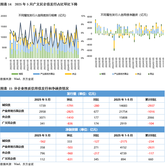 5月多数省份城投债发行量环比减少;1-5月累计,超半数省份城投债发行量和净融资同比下降。产业债方面,5月多数行业信用债发行量环比减少、同比增加;1-5月累计,煤炭、建筑材料、交通运输、国防军工和纺织服饰行业信用债累计净融资为负,多数行业信用债发行量及净融资弱于去年同期。