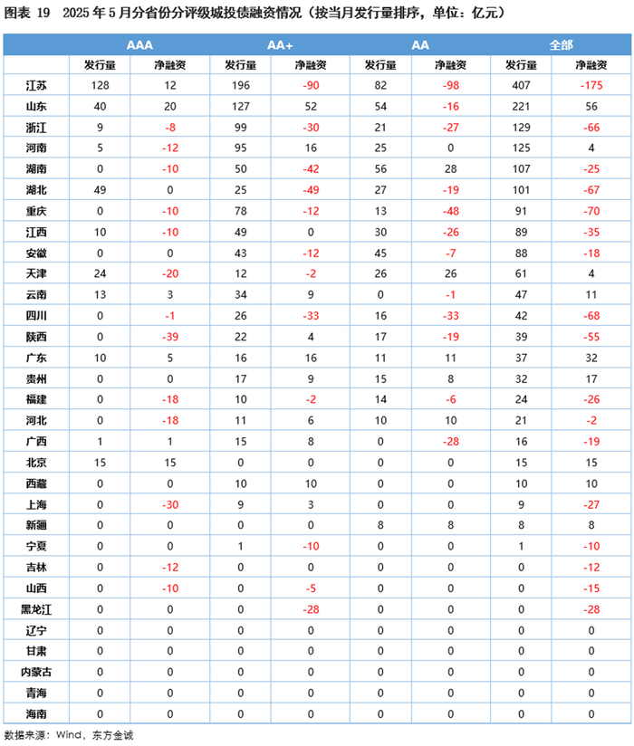 分评级来看,5月AAA级、AA+级和AA级城投债净融资为负的省份分别有13个、12个和12个。其中,陕西、上海和天津等地的AAA级平台,江苏、湖北、湖南、四川、浙江和黑龙江等地的AA+级平台,以及江苏、重庆、四川、广西、浙江和江西等地的AA级平台净融资缺口较大。