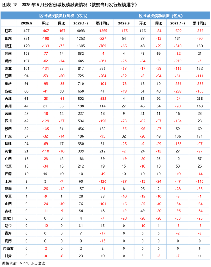 城投债分省份看,5月25个省份城投债发行量环比减少,17个省份城投债净融资为负,环比减少2个。5月城投债发行量位列前三的省份为江苏、山东和浙江,这三个省份的发行量环比均减少,同比仅山东有所增加,江苏和浙江净融资缺口环比收窄。其他省份中,约半数省份城投债净融资环比减少,天津、安徽、吉林、贵州、河南和云南等地净融资环比增加;化债重点省份中,黑龙江、辽宁、内蒙古、青海、甘肃和吉林当月未发行城投债,重庆、黑龙江、广西、吉林和宁夏当月净融资额为负。
