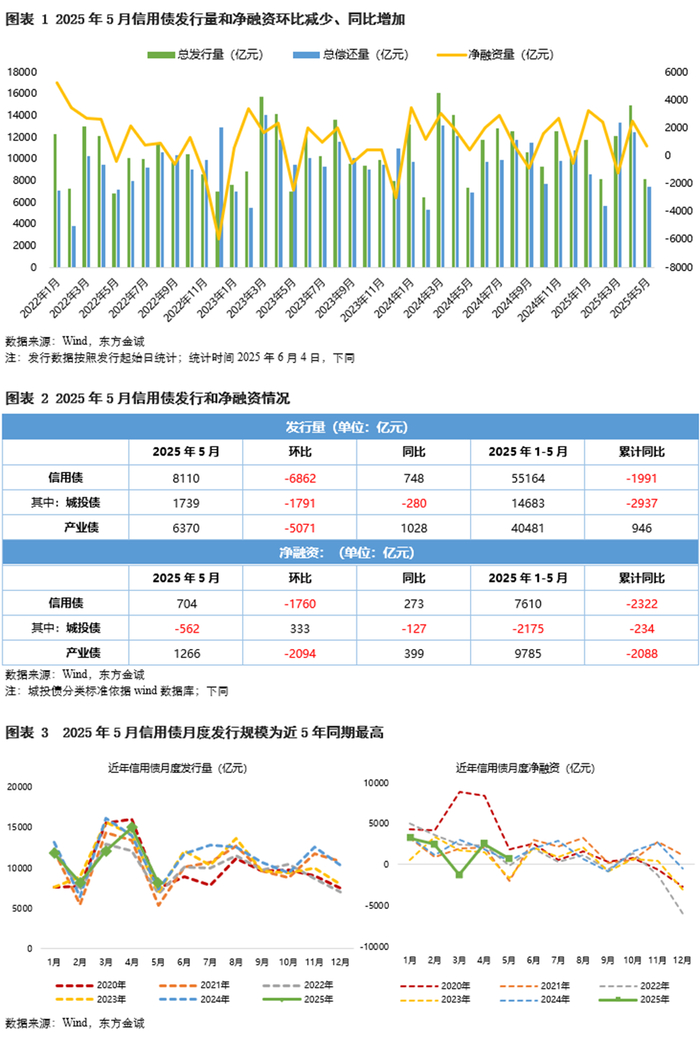 受“补年报”效应影响,5月信用债融资季节性回落。5月信用债发行量8110亿元,环比减少45.8%,同比增长10.2%;净融资环比减少1760亿元,同比增加273亿元。5月城投债和产业债融资延续分化:城投债发行量环比、同比均减少,净融资缺口环比小幅收缩,同比走阔;产业债发行量和净融资均为近5年同期最高水平。