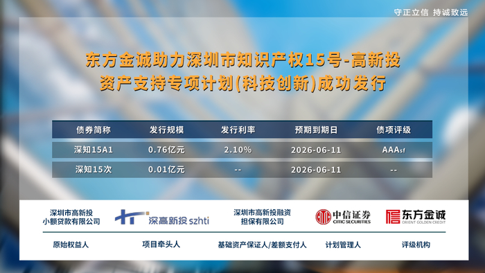 近日,由东方金诚评级的“深圳市知识产权15号-高新投资产支持专项计划(科技创新)”(以下简称“本期专项计划”)在深交所债券市场成功发行。本期专项计划发行规模0.77亿元。其中,优先级发行规模0.76亿元,发行利率2.10%。