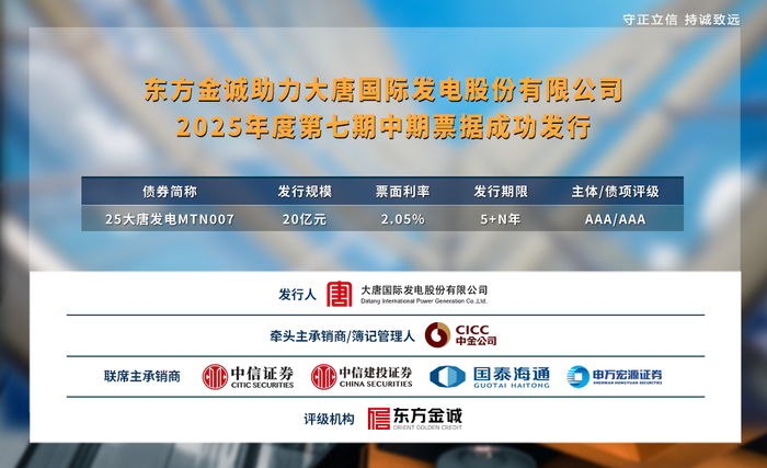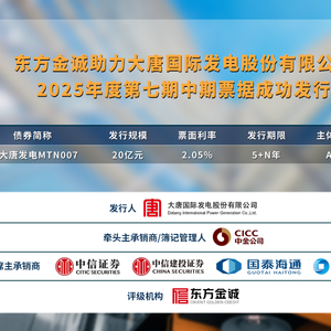近日,由东方金诚评级的“大唐国际发电股份有限公司2025年度第七期中期票据”(以下简称“本期中期票据”)在银行间债券市场成功发行。本期中期票据发行规模20亿元,发行利率2.05%,发行期限5+N年。