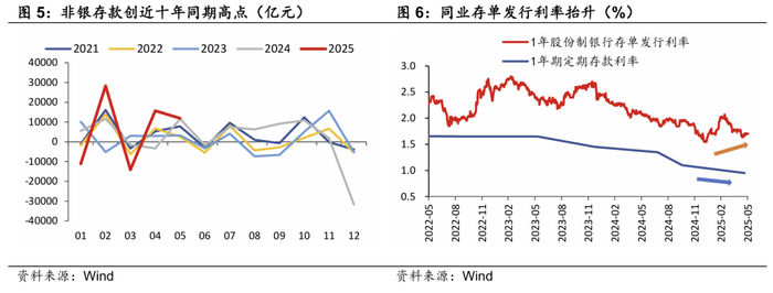 最新公布的金融数据显示,5月新增非银(非银行金融机构)存款11900亿元,创近十年同期新高。存款利率下调引发的资金加速流向非银领域的“存款搬家”效应再次得到数据印证。尽管总体来看,资金只是在不同金融产品之间流动,并没有完全离开银行体系,但存款流向非银后银行机构负债稳定性降低。为追求稳定负债,银行机构对同业存单等同业负债工具的依赖更高。同时存款利率下调后,银行存款产品与资管产品的利差走阔,也将加剧“存款搬家”现象。若存款搬家趋势延续,银行负债端面临流失压力,资产端可能被动缩表。整体而言,资金流向非银领域的趋势或延续,将进一步影响金融市场结构。