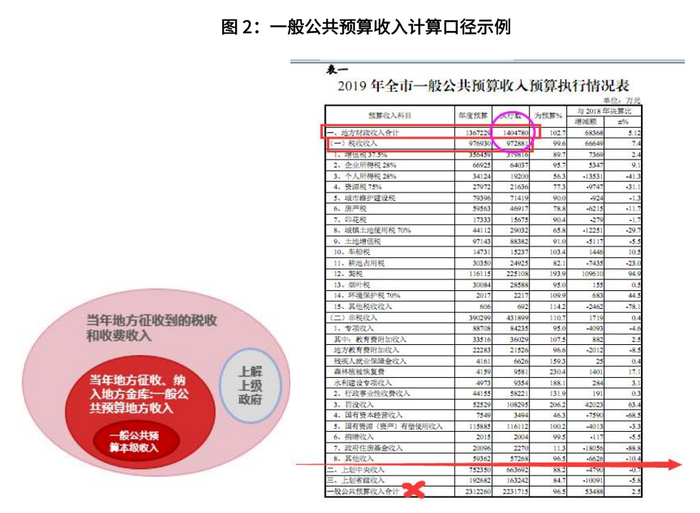 在查找使用财政数据时必须使用全口径数据,不可使用单纯的分地区、市级、本级、市本级等口径的数据。一般公共预算总收入或者财政总收入是包含了上解上级政府的收入,当地政府无法动用此部分收入;而全口径的一般公共预算收入才是地方征收、纳入地方金库的收入,因此我们应选择全口径的一般公共预算收入作为计算口径。此外,需注意本级收入未包含下级政府收入,可类比母公司和合并报表的关系,因此也不能选为一般公共预算收入计算口径。