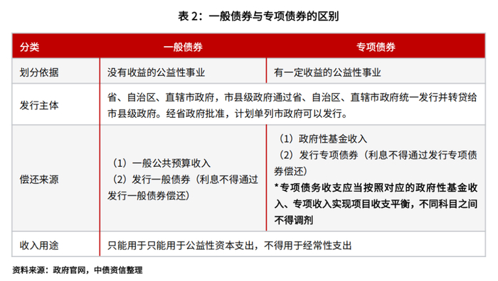 按照偿债资金来源划分,地方债可分为一般债券和专项债券。其中,一般债券是为没有收益的公益性项目发行的、约定一定期限内主要以一般公共预算收入还本付息的政府债券,需列入一般公共预算与政府赤字管理;专项债券是为有一定收益的公益性项目发行的、约定一定期限内以公益性项目对应的政府性基金或专项收入还本付息的政府债券,不纳入赤字管理。
