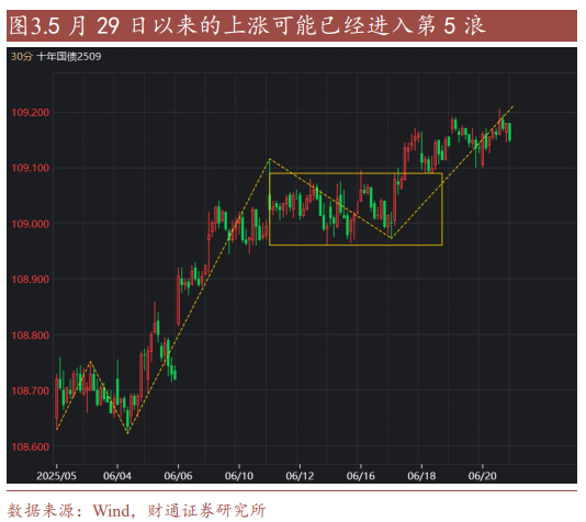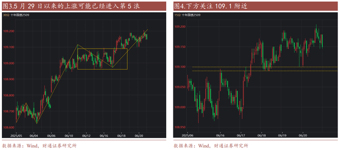10年国债期货本周结束调整、延续上涨,当前可能处于5月29日以来上涨的第5浪中。本轮上涨较为流畅,短线来看6月11日至16日震荡箱体上沿109.1附近多次形成支撑,后续仍需关注这一位置的支撑情况,如果支撑失效可能进入调整,在此之前可以顺势而为。