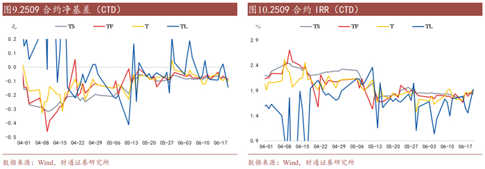 至6月20日,各期限国债期货2509合约CTD净基差整体下行、TF2509持平前值,2年、5年、10年、30年期2509合约CTD净基差分别为-0.10、-0.08、-0.11、-0.14元。