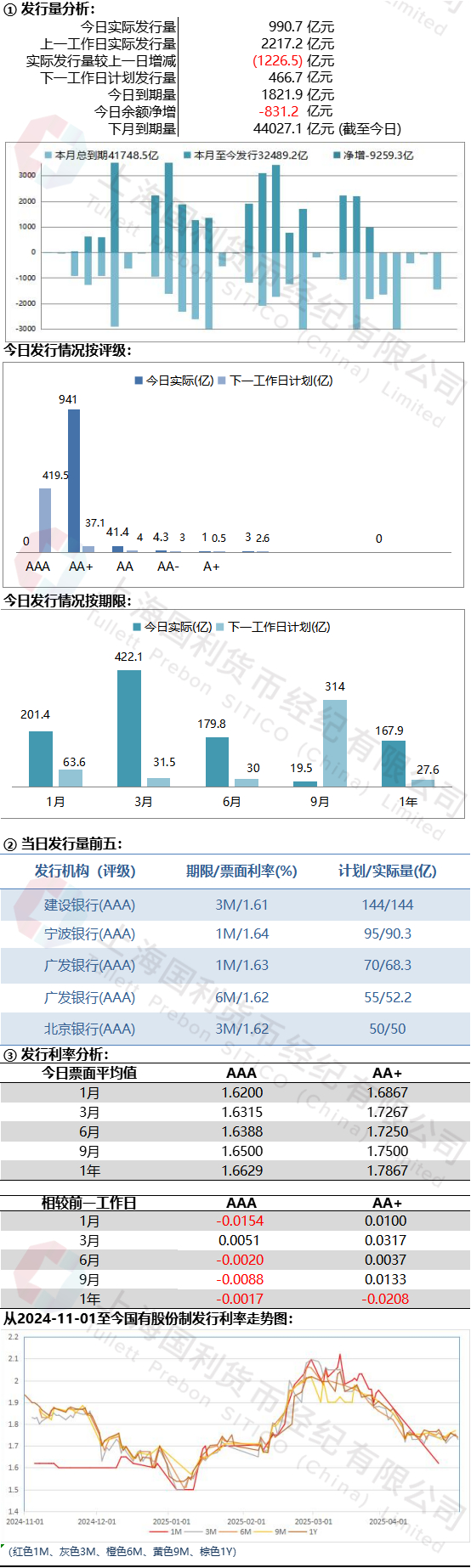 存单一级市场,受到期日影响多数期限较为平淡。1M期限部分大型AAA城商在1.64%募集到部分量;3M期限大行国股发行价格较低全天少人问津,部分AA+城商在1.72%左右募集少许量;6M同样少有国股大行发行,部分AAA城农商在1.66%左右表现不错;9M期限个别大行国股1.65%较为火爆,AAA城商在1.66%-1.68%位置迅速起量受到买盘青睐;1Y期限,大行国股城商均较为清淡鲜有募集量。