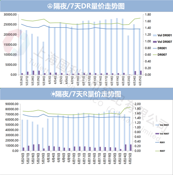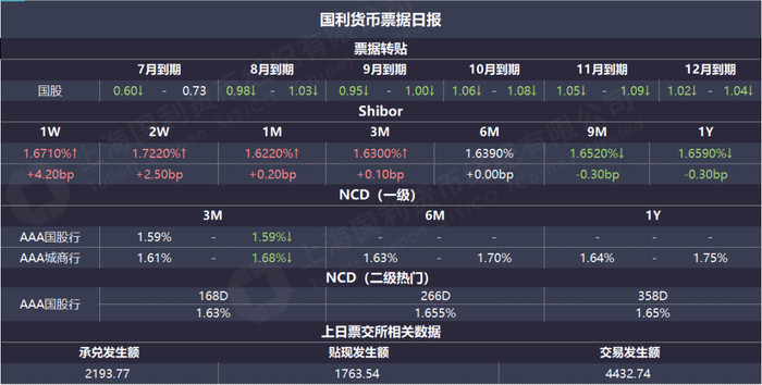存单二级市场各期限收益小幅上行。月内成交在1.50~1.52%附近,买盘关注较高,供不应求。7月到期波动较大,早盘成交在1.65%附近,后续上浮至1.70%,情绪逐渐转弱。8月到期成交在1.63~1.64%附近,9月到期成交在1.61~1.62%前后,城商行1.63~1.64%成交,整体波动不大。四季度大行国股成交在1.62~1.635%附近,买盘关注较高。次年一季度到期早盘国股大行成交在1.64~1.655%附近,城商行成交在1.66~1.67%左右,4~5月足年大行国股成交在1.645~1.655%附近,足年早盘国股陆续成交在1.64~1.6425%前后,后续陆续被gvn至大行1.65%,国股1.655%前后,全天频繁成交,城商行成交在1.66~1.6875%前后,跨季交割大行成交在1.635%附近,买盘交投活跃,尾盘价格企稳。