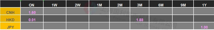 CNH市场,隔夜报价在2.00-1.50%, 成交1.70%-1.60%;一周报价在2.00%-1.50%;两周报价2.00%-1.50%;一个月报价2.00%-1.50%;两个月报价1.90%-1.50%;三个月报价1.90%-1.50%;六个月报价1.90%-1.50%;一年报价1.90%-1.50%。