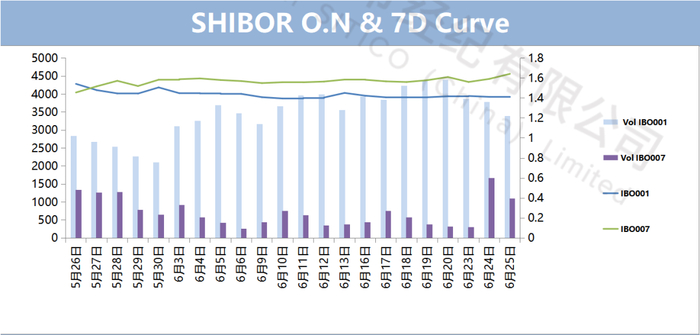 境内市场,隔夜报价4.25%-4.28%, 主要成交 4.27-4.26%,一周报价在4.37%-4.32%, 成交4.35%附近;两周报价4.38%-4.32%;一个月报价4.40%-4.30%;两个月报价4.42%-4.32%;三个月报价4.45%-4.32%; 六个月报价4.50%-4.35%;九个月报价4.50%-4.35%;一年期报价4.55%-4.35%。