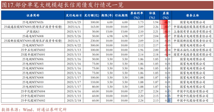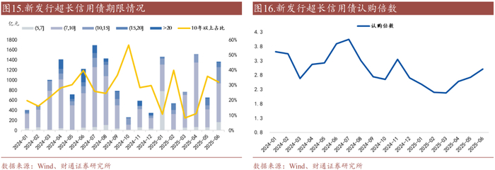 ②从发行期限来看,2024年以来超长信用债发行以7-10年为主,近两月10年以上占比有所提升。2025年上半年,1月受跨年资金调配影响,3月受资金面影响债市波动剧烈,4月受中美对等关税影响,整体市场不确定性高,故这三个月超长债发行期限相对偏短,其余2月、5月、6月,10年以上超长债发行占比位于高位,哪怕是在市场回调明显的2月,占比也达到39.70%。