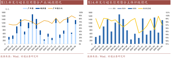 ①从城投/产业分类来看,目前超长信用债发行主要还是集中在产业主体上,且该比例在2025年上半年呈现出逐渐走高的态势,5月新发行债券中产业债占比接近9成,6月略有下降,但也在83%以上。从主体评级来看,还是以AAA为主,AA+/AA发行超长债的难度相对较大。