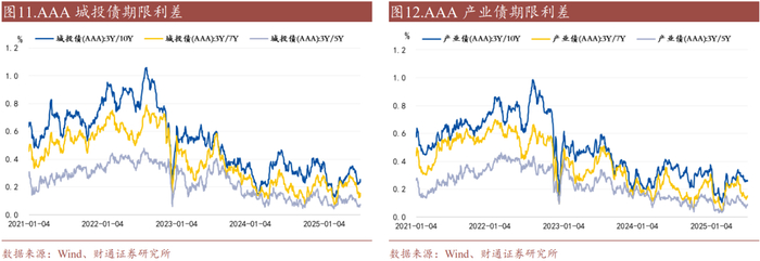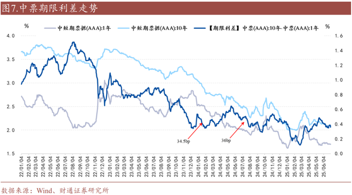 我们观察AAA中票10Y-1Y的期限利差,其在2024年下行过程中的低点为35bp左右,而截止7月2日,期限利差为36bp,进一步压降的空间比较有限。
