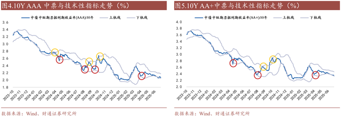 我们构建了“2倍标准差”来作为债券收益率曲线走势的辅助分析指标,从2024-2025年的走势来看,当收益率上行之时,会受到上轨线的压力,一旦当其通道变窄、触及上沿或向上突破时,容易形成向下的驱动,比如2023年10月中、2024年4月初、2024年9月初、2024年10月中、2025年3月中的几次市场行情;而当其向下突破下轨线时,后续似乎有可能出现一定的回撤,比如2024年4月中、8月初、2025年4月中的走势。