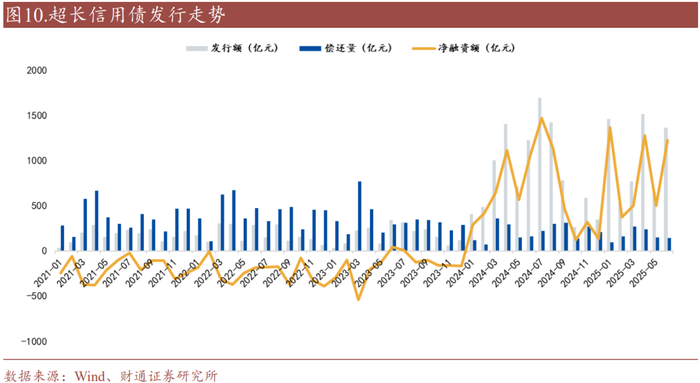 进入2025年之后,尽管债市处于波动调整之中,但超长信用债的发行仍然位于较高位置,1月和4月发行量分别为1,460.70亿元和1,513.52亿元,直逼2024年高点。在5月受报告期影响发行整体偏弱之后,超长信用债在6月市场利率下行周期内发行再次冲高,发行量和净融资额分别为1364.62亿元和1,223.85亿元。