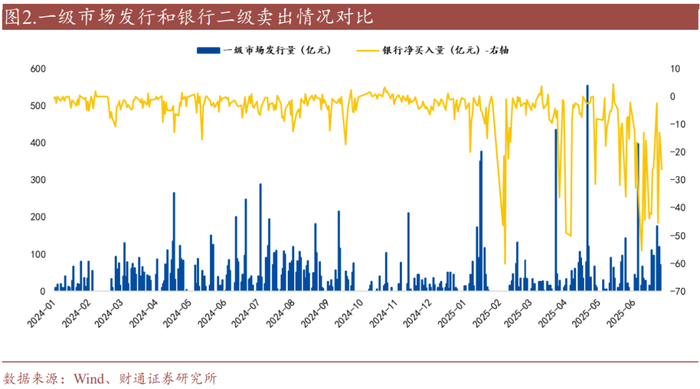 2024银行在二级市场上的净卖出量始终处于低位。2025年上半年,一级市场出现了4次单日发行高点,分别为1月16日(349.79亿元)、3月25日(435亿元)、4月22日(554.2亿元)和6月6日(397亿元),而银行后续在二级市场的阶段性卖出高点分别在2月7日(60亿元)、4月7日(50亿元)、4月29日(32亿元)、6月9日-6月18日(日均37亿元),除了第四次之外,前三次一级市场发行高点和银行二级市场卖出高点之间均存在较大的间隔期,而第四次表现出的银行短时间内集中卖出,背后的原因可能更多的是临近年中季末止盈。