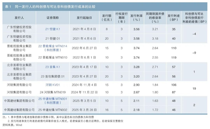从发行成本比较来看,笔者筛选出同一发行人在相同月份采用公募方式发行的具有相同期限的科创债和普通债券,以这两种债券的发行利率分别减去同期限国开债收益率的方式得到个券发行利差,再将这两个发行利差相减。从结果来看,大多数科创债与非科创债发行利差的差值在10BP以内(见表1),说明科创债对发行成本的影响较小。