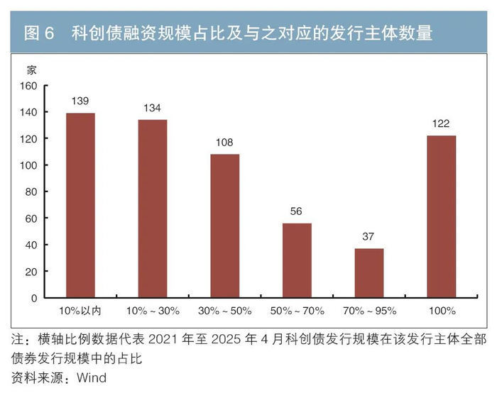 科创债用于支持科创领域融资,对发行主体评级无强制要求,并且对发行主体资产负债率、盈利能力等财务指标的要求相对宽松,这使得一些不满足普通债券发行要求的主体可以通过科创债募集资金,投向科技创新领域。笔者根据万得(Wind)数据进行统计后发现,2021年至2025年4月末,科创债的发行主体(剔除只发行资产支持票据的主体)共有596家,其中有122家仅发行科创债,这类企业数量占比为20.47%(见图6)。
