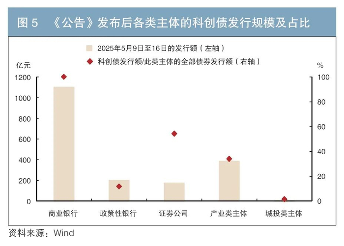 《公告》发布后,科创债自2025年5月9日起发行。5月9日至16日,科创债共发行1865亿元,其中商业银行发行1100亿元,政策性银行发行200亿元,证券公司发行174亿元,产业类主体发行386亿元,城投类主体发行5亿元(见图5)。在产业类主体中,民营企业发行63亿元,占比上升至16%(明显高于全部产业债中民营企业6%的发行规模占比),发行主体包括科大讯飞、吉利控股等9家民营企业。
