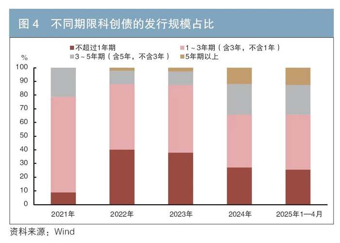 科创债类型呈现多元化,其中公司债、短期融资券、超短期融资券和中期票据占比较大,此外,还辅以少量的非公开定向债务融资工具、资产支持票据和可交换债券(见图3)。从发行期限来看,2023年以前,科创债以3年期以内品种为主;自2024年以来,3~5年期、5年期以上债券的发行规模占比有所上升(见图4)。