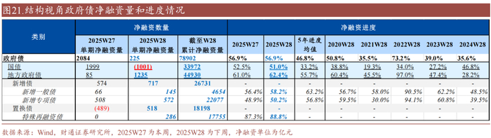 结构上,国债净融资进度为51.0%(高于历史均值),新增地方政府一般债/新增地方政府专项债/特殊再融资债发行进度分别为58.2%(低于历史均值)/50.2%(低于历史均值)/88.8%: