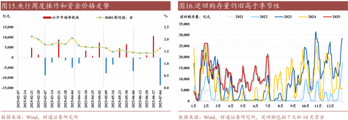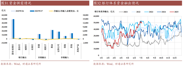 过去一周,7月初央行净回笼力度加大,但跨季过后、财政支出增加、信贷冲量结束等因素带动大行中长期负债端改善,国有行净融出显著增加,隔夜资金利率下台阶。
