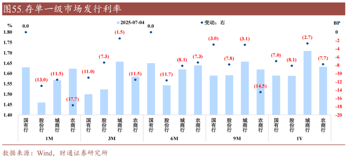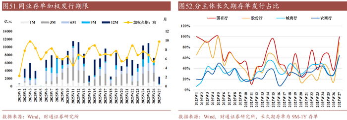 ①存单发行加权久期上升至9.75月,各类银行发行久期均抬升,各类银行长久期存单发行占比抬升明显;