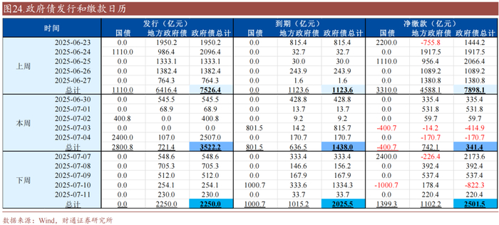 (2)下周国债净融资-1001亿元,国债净融资进度51.0%,高于季节性,地方债净融资1235亿元,地方债净融资进度62.4%,高于季节性,其中新增地方债净融资抬升至717亿元(新增地方政府一般债发行145亿元,新增地方政府专项债发行572亿元),置换债净融资为518亿元(其中特殊再融资债发行286亿元)。