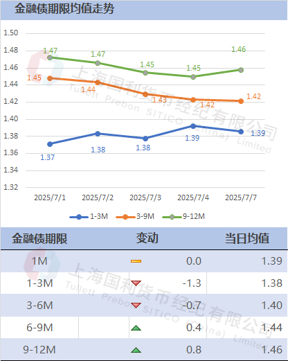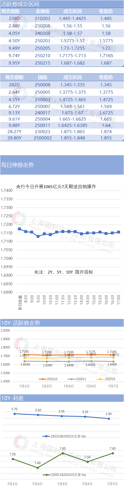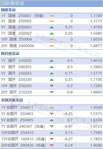 金融债方面:1年国开230202成交在1.45-1.455;1年非国开250411成交在1.45;3年国开240203成交在1.5725-1.58;3年非国开250403在1.5575;5年国开250203成交在1.57-1.5775;5年非国开250405成交在1.6275-1.63;7年国开220220成交在1.705-1.71;7年非国开240307无成交;10年国开250205成交1.7255-1.73;10年非国开250410成交在1.755-1.76。