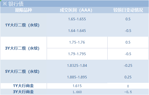 今日银行债成交情绪不减,成交收益开盘后全天震荡不止。截止收盘,二级短端多成交在估值至估值+0.5bp附近,成交收益率较上周五上行0.5bp左右;二级长端多成交在估值至估值-0.5bp附近,成交收益率较上周五下行0.5bp左右。永续短端多成交在估值至估值-0.5bp附近,成交收益率较上周五下变化不大;永续长端多成交在估值至估值-0.25bp附近,成交收益率较上周五上行0.25bp左右。商金短端多成交在估值附近,成交收益率较上周五变化不大,商金长端多成交在估值至估值-0.5bp附近,较上周五下行0.5bp左右。5Y大行二级尾盘落在1.84附近,5Y大行永续落在1.8925附近;3.3Y大行二级落在1.77附近,3.14Y大行永续落在1.815附近,2.81Y国股商金落在1.67附近。今日二级短端以基金、券商和理财子为主要买盘,二级长端以保险资管、券商和基金为主要买盘;永续短端以理财子、券商和基金为主要买盘,永续长端以基金、保险资管和券商为主要买盘;商金债买盘以基金、券商和银行为主要买盘。