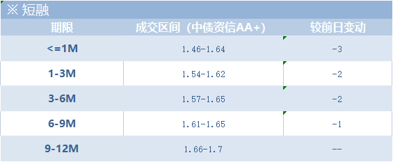 今日资金市场较宽松,短融市场情绪一般,收益稍有下行。月内到期AAA成交在1.46-1.64,买盘主要为基金和资管,8D浙能源和11D上海机场均成交在1.55,11D银河证券成交在1.50位置;三季度AAA成交在1.54-1.62,资管和理财持续配置,银行ofr获得买盘青睐,37D招商局成交在1.55,43D电网成交在1.54,68D(休2)电网成交在1.60位置,78D南航集在1.58位置被哄抢;四季度AAA成交在1.57-1.65,买盘多为基金和资管,108D苏交通和130D招商局均成交在1.59;跨年一季度AAA成交在1.61-1.65,185D浙交投在1.61位置成交;更长期限AAA成交寥寥。