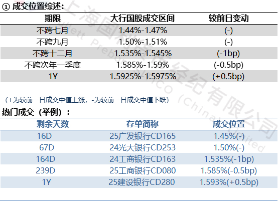 存单一级市场,相较上周情绪有所回落,观望情绪较重,城农商表现相对亮眼。其中1M国股1.45%-1.46%位置发行,需求寥寥,AAA城商1.50%以上募集到部分量;3M大行国股1.52%发行少量,AAA城商则在1.54%到1.55%得到市场青睐多有募集满;6M大行国股1.52%区间全天几无成交,然而AAA城商则在1.60%到1.62%发行情况良好;9M大行国股在1.59%逐渐起量,AAA城商1.62%以上募集到一定需求;1Y大行国股1.59%再次起量,但买盘情绪较昨日有所减弱,AAA城商则在1.62%至1.65%有不少买盘入场。