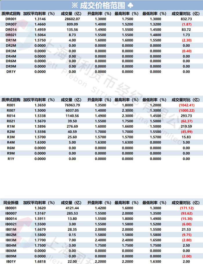 今日资金面呈先宽松后均衡态势。早盘市场偏宽松,隔夜押利率加权+5至+10成交、押存单1.48%附近ofr。7天押利率存单1.48-1.5%融出、14d 押利率1.45%附近bid、押信用1.5%bid。随后隔夜押利率1.3-1.35%成交、押存单1.45%bid。午盘伊始,市场回归均衡,隔夜押利率1.3-1.4%bid、押存单1.45-1.48%成交。至尾盘,隔夜押利率1.35%以内bid大量、押存单1.42-1.45%bid、买盘堆积、增补头寸需求旺盛。中长期方面,14d 押利率加权成交少量、押信用1.5%附近bid、1m 押利率1.55%附近bid。