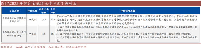 2025年评级下调的金融主体仅为中航产融和榆次农商行,中航产融评级下调主要原因是受到子公司中航信托被托管的影响,经营面临重大不确定性,此外,股票终止上市及摘牌等相关事项对中航产融的融资环境及信用质量将产生不利影响。