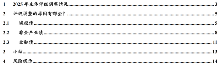 整体来看,城投评级更加关注于区域整体实力以及政府政策的支持情况,产业债主体评级调整的原因则多为自身的经营能力和财务状况,尤其是对于债务的偿付能力。同时相较于非金产业债,中小金融债主体的展业与当地环境的联系更为紧密,所以当地外部环境的变化也是其评级调整的重要原因之一。