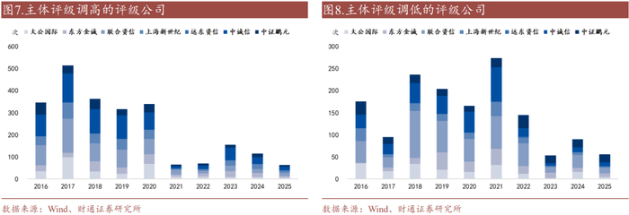 从评级公司的角度来看,2025年上调评级的评级公司主要是联合资信和中诚信,下调评级的主要是联合资信和中证鹏元。