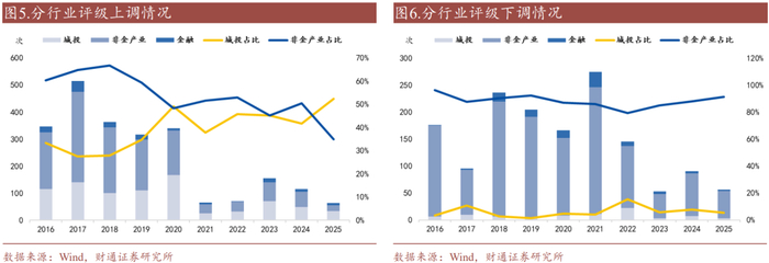 分企业性质来看,非金产业是评级下调的主力军,近年来占比始终稳定在80%以上,其中转债主体是重要的组成部分。截至7月12日,非金产业共有51家主体发生评级下调,其中涉及转债主体下调49家,占比超过95%。城投债评级整体向好,主体评级上调中城投债占比攀升,2025年超过50%。金融债评级调整相对较少,2025年仅下调主体评级2次,为中航产融和山西榆次农商行。