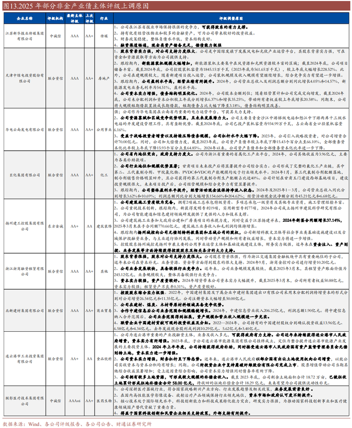 ③财务指标表现良好,盈利能力增强。盈利能力作为产业类主体的核心指标之一,反映企业的经营效益和行业发展态势。如天津绿电评级提升的原因之一为跟踪期内盈利水平高,经营业绩有所提升。2024年,公司营业总收入及利润总额分别同比增长4.05%和14.57%,新能源发电业务毛利率为54.51%,盈利水平高。扬州建工加大政府公建和厂房类项目的承揽力度,同时受益于江苏扬建并表,2024年新签合同额增长37.14%,2025年3月末在手合同额770.66亿元,建筑施工业务收入和毛利润均保持增长。