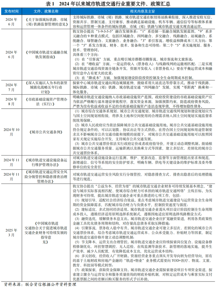 2024年以来,交通运输部、国家铁路局和中国城市轨道交通协会(以下简称“轨交协会”)等单位针对城市轨道交通的经营管理、安全监管、融合城轨发展、项目投资建设管理、财政补贴机制等方面出台了一系列意见、办法和指南等,保障城市轨道交通行业可持续发展。