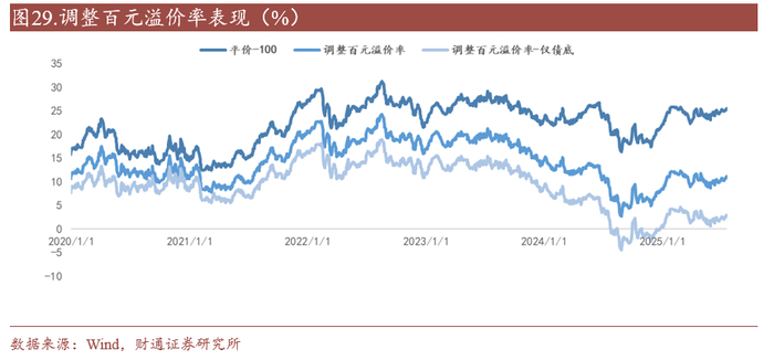 调整百元溢价率震荡。剔除债性、剩余期限等因素影响的调整百元溢价率水平11.01%,处于近半年以来的64.3%历史分位,2018年以来41.2%历史分位,仅考虑债底的调整百元溢价率处于近半年以来61.7%历史分位,2018年以来12.5%历史分位。