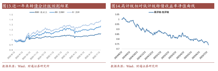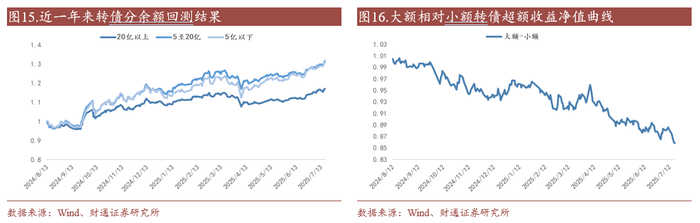 本周转债市场小额低评级偏股风格占优。截至本周最后一个交易日,高评级转债相对低评级转债超额收益-3.13pct,大额转债相对小额转债超额收益-2.46pct,偏股转债相对偏债转债超额收益4.63pct。