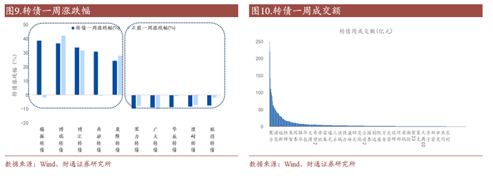 本周锡振转债、甬矽转债上市。两市合计342只转债上涨,占比73%,涨跌幅居前五的为锡振转债(38.82%)、博瑞转债(36.83%)、博汇转债(33.80%)、甬矽转债(30.91%)、聚隆转债(24.43%),涨跌幅居后五的为塞力转债(-9.74%)、广大转债(-8.86%)、华辰转债(-8.71%)、濮耐转债(-8.32%)、联得转债(-7.44%);从相对估值的角度来看,217只转债转股溢价率抬升,占比46%,估值变动居前五的为英科转债(50.80%)、宝莱转债(14.62%)、山玻转债(14.11%)、福莱转债(13.25%)、立高转债(12.12%),估值变动居后五的为山石转债(-69.31%)、科沃转债(-55.33%)、恒帅转债(-47.40%)、佳力转债(-33.08%)、汇通转债(-29.07%)。
