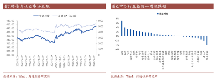 截至周五收盘,上证指数收于3534.48点,一周上涨0.69%;中证转债收于453.86点,一周上涨0.67%。从股市行业表现情况看,涨幅前三行业为通信(7.02%)、医药(3.91%)和汽车(3.22%),跌幅前三行业为综合金融(-4.12%)、房地产(-2.08%)和传媒(-1.58%)。