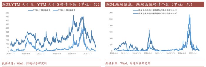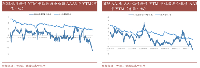 YTM方面,银行转债YTM中位数-5%,低于3年企业债AAA到期收益率6.72pct;AA-至AA+偏债转债YTM中位数-0.94%,低于3年企业债AA到期收益率2.84pct。