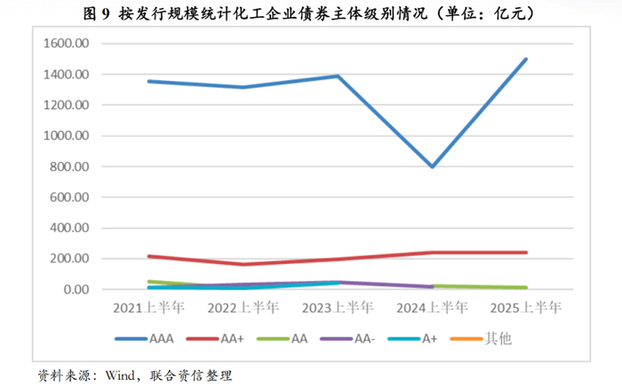 2025年1-6月,在利率下行的背景下,化工行业整体呈现净融资状态,化工企业发行债券规模同比增长,且期限向中长期倾斜。AAA企业仍然为主要的发行主体。